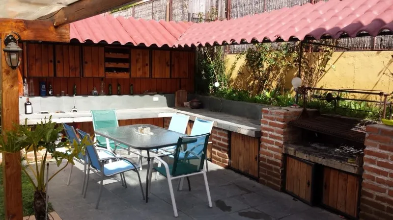 El exterior tiene una amplia terraza, quincho, con muebles de pino Oregón,